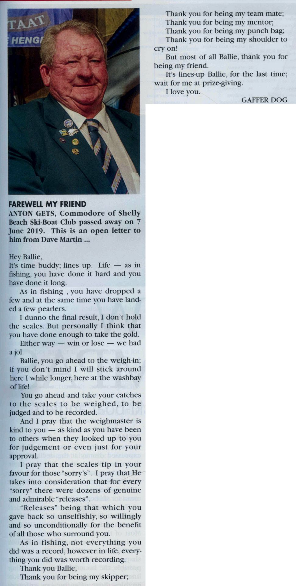 Anton made friends wherever he went and will be sorely missed, especially among the Deep Sea Angling community as well his beloved partner Anne, his children Michelle, Candice and Grant and many grandchildren.